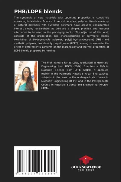 The synthesis of new materials with optimized properties is constantly advancing in Materials Science. In recent decades, polymer blends made up of natural polymers with synthetic polymers have aroused considerable interest among researchers as they are a simple, practical and low-cost alternative to be used in the packaging sector. The objective of this work consists of the preparation and characterization of polymeric blends consisting of biodegradable polymer, poly(3-hydroxybutyrate( (PHB) and synthetic polymer, low-density polyethylene (LDPE), aiming to evaluate the effect of different PHB contents on the morphology and thermal properties of LDPE blends prepared by melting.