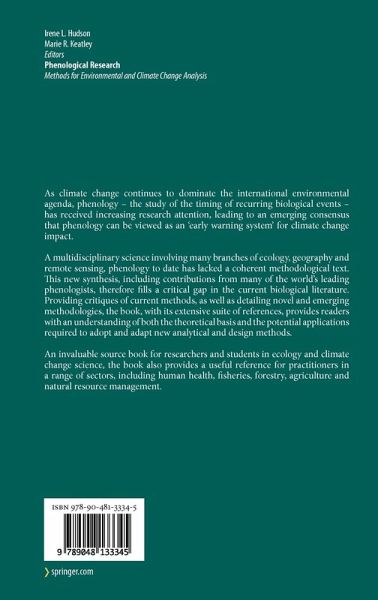 A multidisciplinary science involving many branches of ecology, geography and remote sensing, phenology to date has lacked a coherent methodological text. This new synthesis, including contributions from many of the world's leading phenologists, therefore fills a critical gap in the current biological literature. Providing critiques of current methods, as well as detailing novel and emerging methodologies, the book, with its extensive suite of references, provides readers with an understanding of both the theoretical basis and the potential applications required to adopt and adapt new analytical and design methods.