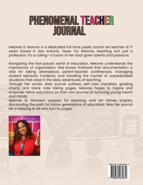 Melonie G. Morrow is a dedicated full-time public school art teacher of 17 years based in San Antonio, Texas. For Melonie, teaching is not just a profession; it is a calling a fusion of her God-given talents and passions. Navigating the fast-paced world of education, Melonie understands the importance of organization. She knows firsthand that documentation is vital for taking attendance, parent-teacher conferences, managing student behavior incidents, and handling the myriad of unpredictable situations that arise in the daily adventures of teaching. Through her words, daily journal outlines, self-care checklists, grading charts, and blank note taking pages, Melonie hopes to inspire and empower fellow educators on their own journey of nurturing young hearts and minds. Melonie G. Morrow's passion for teaching and art shines brightly, illuminating the path for future generations of educators. May her journal be a blessing to all who turn its pages.