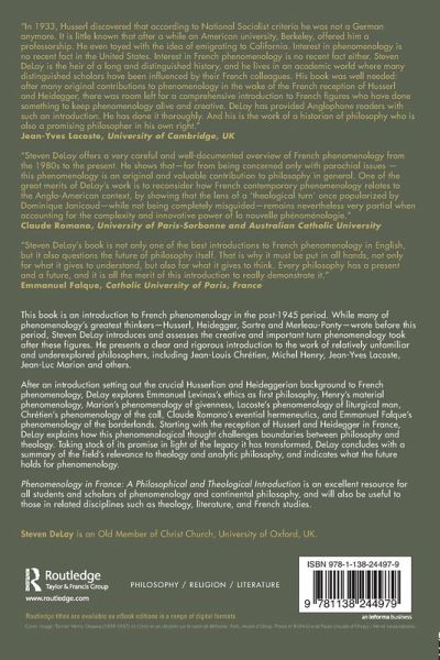 This book is an introduction to French phenomenology in the post-1945 period. While many of phenomenology's greatest thinkers-Husserl, Heidegger, Sartre and Merleau-Ponty-wrote before this period, Steven DeLay introduces and assesses the creative and important turn phenomenology took after these figures. He presents a clear and rigorous introduction to the work of relatively unfamiliar and underexplored philosophers, including Jean-Louis Chrétien, Michel Henry, Jean-Yves Lacoste, Jean-Luc Marion and others. After an introduction setting out the crucial Husserlian and Heideggerian background to French phenomenology, DeLay explores Emmanuel Levinas's ethics as first philosophy, Henry's material phenomenology, Marion's phenomenology of givenness, Lacoste's phenomenology of liturgical man, Chrétien's phenomenology of the call, Claude Romano's evential hermeneutics, and Emmanuel Falque's phenomenology of the borderlands. Starting with the reception of Husserl and Heidegger in France, DeLay explains how this phenomenological thought challenges boundaries between philosophy and theology. Taking stock of its promise in light of the legacy it has transformed, DeLay concludes with a summary of the field's relevance to theology and analytic philosophy, and indicates what the future holds for phenomenology. Phenomenology in France: A Philosophical and Theological Introduction is an excellent resource for all students and scholars of phenomenology and continental philosophy, and will also be useful to those in related disciplines such as theology, literature, and French studies.