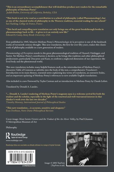 "Landes' excellent translation preserves the fluidity and subtlety of Merleau-Ponty's philosophical prose. Phenomenology of Perception is finally available in an English-language edition fully adequate for the purposes of scholarship, and which allows the reader to appreciate with accuracy the distinctive patterns and movements of Merleau-Ponty's thought." - Sebastian Gardner, University College London, UK