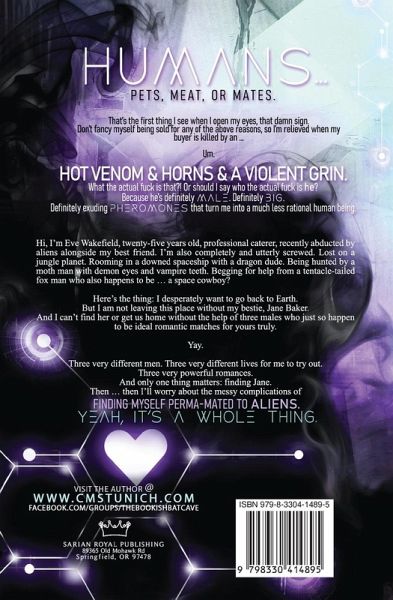 Humans ... pets, meat, or mates.That's the first thing I see when I open my eyes, that damn sign.Don't fancy myself being sold for any of the above reasons, so I'm relieved when my buyer is killed by an ... Um.Hot venom and horns and a violent grin. What the actual fuck is that?! Or should I say who the actual fuck is he?Because he's definitely male. Definitely big. Definitely exuding pheromones that turn me into a much less rational human being.Hi, I'm Eve Wakefield, twenty-five years old, professional caterer, recently abducted by aliens alongside my best friend. I'm also completely and utterly screwed. Lost on a jungle planet. Rooming in a downed spaceship with a dragon dude. Being hunted by a moth man with demon eyes and vampire teeth. Begging for help from a tentacle-tailed fox man who also happens to be ... a space cowboy?Here's the thing: I desperately want to go back to Earth. But I am not leaving this place without my bestie, Jane Baker.And I can't find her or get us home without the help of three males who just so happen to be ideal romantic matches for yours truly.Yay.Three very different men. Three very different lives for me to try out. Three very powerful romances.And only one thing matters: finding Jane. Then ... then I'll worry about the messy complications of finding myself perma-mated to aliens.Yeah, it's a whole thing.