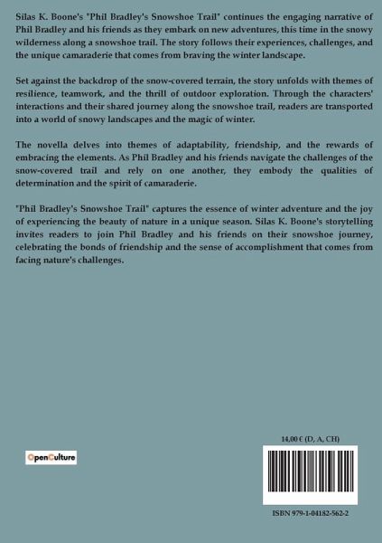 Silas K. Boone's "Phil Bradley's Snowshoe Trail" continues the engaging narrative of Phil Bradley and his friends as they embark on new adventures, this time in the snowy wilderness along a snowshoe trail. The story follows their experiences, challenges, and the unique camaraderie that comes from braving the winter landscape. Set against the backdrop of the snow-covered terrain, the story unfolds with themes of resilience, teamwork, and the thrill of outdoor exploration. Through the characters' interactions and their shared journey along the snowshoe trail, readers are transported into a world of snowy landscapes and the magic of winter. The novella delves into themes of adaptability, friendship, and the rewards of embracing the elements. As Phil Bradley and his friends navigate the challenges of the snow-covered trail and rely on one another, they embody the qualities of determination and the spirit of camaraderie. "Phil Bradley's Snowshoe Trail" captures the essence of winter adventure and the joy of experiencing the beauty of nature in a unique season. Silas K. Boone's storytelling invites readers to join Phil Bradley and his friends on their snowshoe journey, celebrating the bonds of friendship and the sense of accomplishment that comes from facing nature's challenges.