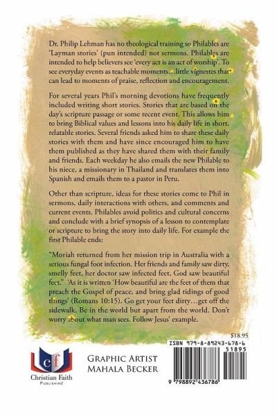 Dr. Philip Lehman has no theological training so Philables are 'Layman stories' (pun intended) not sermons. Philables are intended to help believers see 'every act is an act of worship'. To see everyday events as teachable moments...little vignettes that can lead to moments of praise, reflection and encouragement. For several years Phil's morning devotions have frequently included writing short stories. Stories that are based on the day's scripture passage or some recent event. This allows him to bring Biblical values and lessons into his daily life in short, relatable stories. Several friends asked him to share these daily stories with them and have since encouraged him to have them published as they have shared them with their family and friends. Each weekday he also emails the new Philable to his niece, a missionary in Thailand and translates them into Spanish and emails them to a pastor in Peru. Other than scripture, ideas for these stories come to Phil in sermons, daily interactions with others, and comments and current events. Philables avoid politics and cultural concerns and conclude with a brief synopsis of a lesson to contemplate or scripture to bring the story into daily life. For example the first Philable ends: "Moriah returned from her mission trip in Australia with a serious fungal foot infection. Her friends and family saw dirty, smelly feet, her doctor saw infected feet, God saw beautiful feet." 'As it is written 'How beautiful are the feet of them that preach the Gospel of peace, and bring glad tidings of good things' (Romans 10:15). Go get your feet dirty...get off the sidewalk. Be in the world but apart from the world. Don't worry about what man sees. Follow Jesus' example.