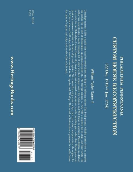 Genealogy research is like a puzzle that must be solved without the help of a reference picture. This book presents valuable puzzle pieces to complete the picture for the Port of Philadelphia, spanning December 22, 1719 through January 7, 1724, with a complete list of ships and their travels. The author has reconstructed a nearly complete list of ships and their voyages across the Atlantic and West Indies to and from Philadelphia. In addition to records for the Philadelphia Custom House, this book shows partial arrival and departure records (including ports other than Philadelphia) and previously unknown interactions between ships and captains. After cross-referencing names, ships, ship types, dates, and ports from the original list of 1453 captains and 1453 ships, the list was concatenated to 294 captains and 288 ships. This wealth of information is presented in a table format. An index of captains and ships adds to the value of this work.