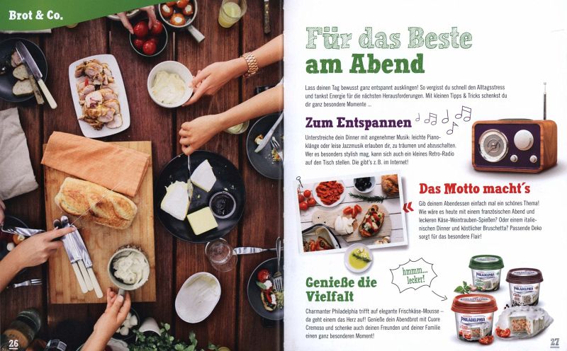 Ob herzhaft oder süß - 50 Rezeptinspirationen verschönern Ihnen den Tag. Leckere Ideen für Brot, Toast und Knäcke, abwechslungsreiche Snacks und verführerische Torten und Desserts - und immer mit dabei, die bunte Vielfalt von Philadelphia.