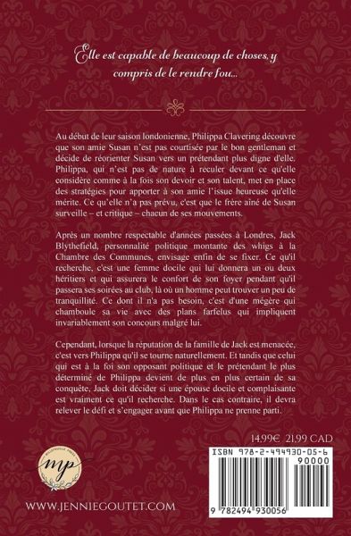 regency j'ai luElle est capable de beaucoup de choses, y compris de le rendre fou... Au début de leur saison londonienne, Philippa Clavering découvre que son amie Susan n'est pas courtisée par le bon gentleman et décide de réorienter Susan vers un prétendant plus digne d'elle. Philippa, qui n'est pas de nature à reculer devant ce qu'elle considère comme à la fois son devoir et son talent, met en place des stratégies pour apporter à son amie l'issue heureuse qu'elle mérite. Ce qu'elle n'a pas prévu, c'est que le frère aîné de Susan surveille - et critique - chacun de ses mouvements. Après un nombre respectable d'années passées à Londres, Jack Blythefield, personnalité politique montante des whigs à la Chambre des Communes, envisage enfin de se fixer. Ce qu'il recherche, c'est une femme docile qui lui donnera un ou deux héritiers et qui assurera le confort de son foyer pendant qu'il passera ses soirées au club, là où un homme peut trouver un peu de tranquillité. Ce dont il n'a pas besoin, c'est d'une mégère qui chamboule sa vie avec des plans farfelus qui impliquent invariablement son concours malgré lui. Cependant, lorsque la réputation de la famille de Jack est menacée, c'est vers Philippa qu'il se tourne naturellement. Et tandis que celui qui est à la foi son opposant politique et le prétendant le plus déterminé de Philippa devient de plus en plus certain de sa conquête, Jack doit décider si une épouse docile et complaisante est vraiment ce qu'il recherche. Dans le cas contraire, il devra relever le défi et s'engager avant que Philippa ne prenne parti. Philippa prend parti est le deuxième volet de la série La chronique des Clavering, après Déshonneur et rédemption . Il s'agit d'une romance de type Régence, écrite dans un style traditionnel, et ne comportant pas de scènes érotiques. ¿ Lauréate du premier prix de la romance historique au Prix des Lecteurs 2022 de la Nouvelle-Angleterre. Philippa prend parti est une romance Régence classique dans la tradition de Georgette Heyer. Elle est racontée avec le charme et la grâce d'un bal de Pemberley et fourmille d'esprit, d'élégance et de vivacité. Audrey Blake, auteure de The Girl in His Shadow, best-seller de USA Today. Jennie Goutet écrit pour une lectrice actuelle une version délicieusement renouvelée du style traditionnel Régence. - Kristi Ann Hunter, auteure de la série Hawthorne House. Philippa prend parti offre un aperçu fascinant des intrigues politiques à l'époque de la Régence, tandis que cette héroïne au tempérament de feu prouve que les contraires peuvent s'attirer. - Carolyn Miller, auteure de la série Regency Brides. Le style éloquent de l'écriture vous happe tandis que l'histoire vous captive du début à la fin. Ce livre est de ceux qu'on n'arrive pas à poser et qui vous gardera debout toute la nuit. Un beau moment d'évasion. - Janice MacLeod, auteure du best-seller du New York Times Paris Letters.