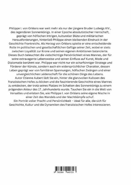 Philippe I. von Orléans war weit mehr als nur der jüngere Bruder Ludwigs XIV., des legendären Sonnenkönigs. In einer Epoche absolutistischer Herrschaft, geprägt von höfischen Intrigen, kultureller Blüte und militärischen Herausforderungen, hinterließ Philippe einen bleibenden Eindruck in der Geschichte Frankreichs. Als Herzog von Orléans spielte er eine entscheidende Rolle im politischen und gesellschaftlichen Gefüge seiner Zeit, wobei er stets zwischen Loyalität zur Krone und seinen eigenen Ambitionen balancierte.Dieses Buch beleuchtet die vielschichtige Persönlichkeit eines Mannes, der für seine extravagante Lebensweise und seinen Einfluss auf Kunst, Mode und Diplomatie berühmt war. Philippe war nicht nur ein scharfsinniger Stratege und Förderer der Künste, sondern auch ein widersprüchlicher Charakter, dessen Leben geprägt war von familiären Spannungen, höfischen Zwängen und einer unvergleichlichen Leidenschaft für die schönen Dinge des Lebens.Autor Étienne Aubert lädt Sie ein,hinter die glanzvollen Kulissen des französischen Hofes zu blicken und die faszinierende Geschichte eines Mannes zu entdecken, der trotz seines Platzes im Schatten des Sonnenkönigs zu einem prägenden Akteur des 17. Jahrhunderts wurde. Tauchen Sie ein in die Welt von Versailles und erleben Sie, wie Philippe I. von Orléans seine eigene Nische in einer Zeit des Wandels und der Machtkämpfe schuf.Ein Porträt voller Pracht und Persönlichkeit - ideal für alle, die sich für Geschichte, Kultur und die Dynamiken des französischen Hofes interessieren.