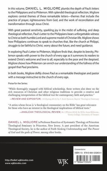 In this latest volume in the Belief series, Daniel L. Migliore plumbs the depth of Paul's letters to the Philippians and to Philemon. With splendid theological reflection, Migliore explores central themes of these remarkable letters--themes that include the practice of prayer, righteousness from God, and the work of reconciliation and transformation through Jesus Christ. Migliore shows how Philippians continues to speak to churches that, like the church at Philippi, struggle to be faithful to Christ, worry about the future, and need guidance. And in Philemon, Migliore finds a letter with importance far beyond its size--a letter that can enrich our understanding of the fullness of the gospel that Paul proclaims. In both books, Migliore deftly shows Paul as a remarkable theologian and pastor with a message instructive to the church of every age.
