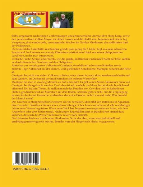 Selbst organisiert, nach einigen Vorbereitungen und abenteuerlicher Anreise über Hongkong, sowie den gerade aktiven Vulkan Mayon im Süden Luzons und die Stadt Cebu, begannen mit einem Tag Verspätung drei wundervolle, unvergessliche Wochen im Norden Mindanaos, der südlichsten Insel der Philippinen. Die komfortable Gästehütte aus Bambus, gerade groß genug für 6 Gäste, liegt an einem schwarzen Sandstrand. Im Umkreis von vierzig Kilometern existiert kein Hotel, nur reines philippinisches Landleben, in das man integriert ist. Exotische Fische, Seeigel und Früchte, wie die größte, an Bäumen wachsende Frucht der Erde, zählen zu den kulinarischen Genüssen auf den Philippinen. Abstecher zur vorgelagerten Vulkaninsel Camiguin, ebenfalls mit schwarzen Stränden, sowie mehrere Tage Aufenthalt auf der kleinen, weiß gleißenden Koralleninsel Mantigue rundeten die Reise ab. Camiguin hat nicht nur sieben Vulkane zu bieten, einer davon ist noch aktiv, sondern auch heiße und kalte Quellen. Im Dschungel der Insel befinden sich mehrere Wasserfälle. Mantigue hat man in zwanzig Minuten zu Fuß umrundet. Es gibt keinen Strom, Süßwasser muss von Camiguin herübergebracht werden. Das Leben ist sehr einfach, die Menschen sind sehr herzlich und offen und Zeit ist kein Thema. So stellt man sich das Paradies vor. Gewohnt wird in halboffenen Hütten, geschlafen wird auf Matratzen auf dem Boden, Schränke gibt es nicht. Für die Verpflegung ist eine Kochecke mit Gaskocher vorhanden, dazu eine Essecke, mehr Luxus ist nicht. Was braucht der Mensch mehr?Das Tauchen in philippinischen Gewässern ist eine Sensation. Man fühlt sich mitten in ein Aquarium hineinversetzt. Glasklares Wasser sowie abwechslungsreiches, bunt-exotisches und sehr reichhaltiges Leben unter Wasser begeistern. Wenn man Glück hat, begegnet man sogar seltenen Arten, wie dem Anglerfisch oder dem Schlangenaal. Nach langen Regenfällen kann es jedoch schon einmal dazu kommen, dass sich das Wasser stellenweise relativ stark eintrübt.Die Heimreise blieb auch nicht ohne Hindernisse. So ist das eben, wenn man individuell und unabhängig unterwegs sein möchte. Beinahe wäre der Flieger nach Hause weg gewesen.