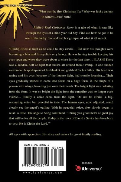 What was the first Christmas like? Who was lucky enough to witness Jesus' birth? Philip's Real Christmas Story is a tale of what it was like through the eyes of a nine-year-old boy. Find out how he got to be one of the lucky few and catch a glimpse of what it all meant. "(Philip) tried as hard as he could to stay awake... But now his thoughts were becoming a blur and his eyelids very heavy. He was having trouble keeping his eyes open and when they were about to close for the last time... FLASH! There was a sudden, bolt of light that shown all around them! Philip, in one sudden movement, leaped up out of his blanket and grabbed for his father. His heart was racing and his eyes, because of the intense light, had trouble focusing... Their eyes gradually started to come into focus on a huge form, in the shape of a person with wings, hovering just over their heads. The bright light was radiating from the form. It was so bright the light from the campfire was no longer even visible... Finally a voice came from the light, 'Do not be afraid,' a big, resonating voice but peaceful in tone. The human eyes, now adjusted, could clearly see the angel's outline. With its peaceful voice, they slowly began to relax, a little. The angelic being continued, 'I bring you good news of great joy that will be for all the people. Today in the town of David a Savior has been born to you; He is Christ the Lord.'" All ages with appreciate this story and makes for great family reading.