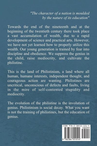 "The character of a nation is moulded by the nature of its education" Towards the end of the nineteenth and at the beginning of the twentieth century there took place a vast accumulation of wealth, due to a rapid development of science and practical arts. However, we have not yet learned how to properly utilize this wealth. Our young generation is trained by fear into discipline and obedience. We suppress the genius in the child, raise mediocrity, and cultivate the philistine. This is the land of Philistinism, a land where all human, humane interests, independent thought, and courageous action are wanting. Philistines are uncritical, unconscious of defects and faults, living in the mire of self-contented stupidity and mediocrity. The evolution of the philistine is the involution of genius. Philistinism is social decay. What you want is not the training of philistines, but the education of genius. _____ Boris Sidis was a brillant psychologist and philosopher of education. He was also the father of the father of William James Sidis, a child prodigy with exceptional mathematical and linguistic skills. This large Print edition, with its clear and easily readable text, ensures optimal accessibility and a comfortable reading experience for all.
