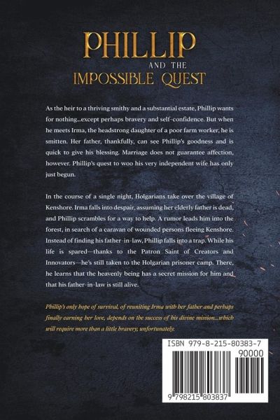 As the heir to a thriving smithy and a substantial estate, Phillip wants for nothing...except perhaps bravery and self-confidence. But when he meets Irma, the headstrong daughter of a poor farm worker, he is smitten. Her father, thankfully, can see Phillip's goodness and is quick to give his blessing. Marriage does not guarantee affection, however. Phillip's quest to woo his very independent wife has only just begun. In the course of a single night, Holgarians take over the village of Kenshore. Irma falls into despair, assuming her elderly father is dead, and Phillip scrambles for a way to help. A rumor leads him into the forest, in search of a caravan of wounded persons fleeing Kenshore. Instead of finding his father-in-law, Phillip falls into a trap. While his life is spared-thanks to the Patron Saint of Creators and Innovators-he's still taken to the Holgarian prisoner camp. There, he learns that the heavenly being has a secret mission for him and that his father-in-law is still alive. Phillip's only hope of survival, of reuniting Irma with her father and perhaps finally earning her love, depends on the success of his divine mission...which will require more than a little bravery, unfortunately.