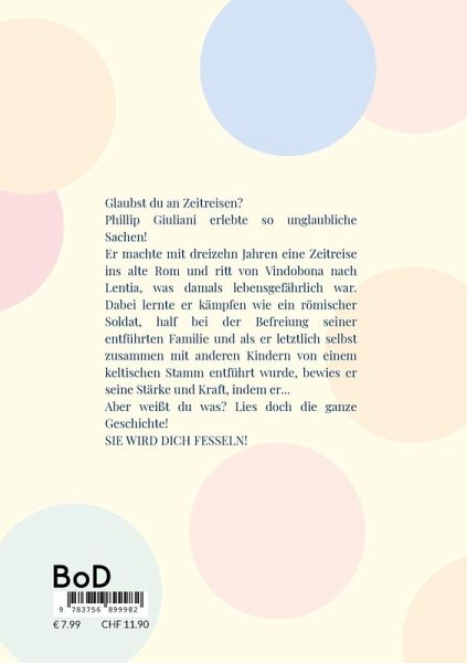 Glaubst du an Zeitreisen?Phillip Giuliani erlebte so unglaubliche Sachen!Er machte mit dreizehn Jahren eine Zeitreise ins alte Rom und ritt von Vindobona nach Lentia, was damals lebensgefährlich war. Dabei lernte er kämpfen wie ein römischer Soldat, half bei der Befreiung seiner entführten Familie und als er letztlich selbst zusammen mit anderen Kindern von einem keltischen Stamm entführt wurde, bewies er seine Stärke und Kraft, indem er...Aber weißt du was? Lies doch die ganze Geschichte!Sie wird dich fesseln!