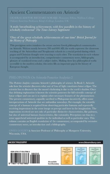 The Posterior Analytics contains Aristotle's philosophy of science. In Book 2, Aristotle asks how the scientist discovers what sort of loss of light constitutes lunar eclipse. The scientist has to discover that the moon's darkening is due to the earth's shadow. Once that defining explanation is known the scientist possesses the full scientific concept of lunar eclipse and can use it to explain other necessary features of the phenomenon. The present commentary, arguably ascribed to Philoponus incorrectly, offers some interpretations of Aristotle that are unfamiliar nowadays. For example, the scientific concept of a human is acquired from observing particular humans and repeatedly receiving impressions in the sense image or percept and later in the imagination. The impressions received are not only of particular distinctive characteristics, like paleness, but also of universal human characteristics, like rationality. Perception can thus in a sense apprehend universal qualities in the individual as well as particular ones. This volume contains an English translation of the commentary, accompanied by extensive commentary notes, an introduction and a bibliography.