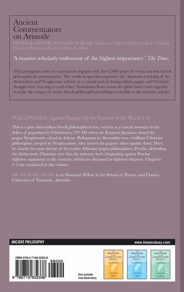 This is a post-Aristotelian Greek philosophical text, written at a crucial moment in the defeat of paganism by Christianity, AD 529, when the Emperor Justinian closed the pagan Neoplatonist school in Athens. Philoponus in Alexandria was a brilliant Christian philosopher, steeped in Neoplatanism, who turned the pagans' ideas against them. Here he attacks the most devout of the earlier Athenian pagan philosophers, Proclus, defending the distinctively Christian view that the universe had a beginning against Proclus' eighteen arguments to the contrary, which are discussed in eighteen chapters. Chapters 1-5 are translated in this volume.