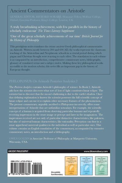 The Posterior Analytics contains Aristotle's philosophy of science. In Book 2, Aristotle asks how the scientist discovers what sort of loss of light constitutes lunar eclipse. The scientist has to discover that the moon's darkening is due to the earth's shadow. Once that defining explanation is known the scientist possesses the full scientific concept of lunar eclipse and can use it to explain other necessary features of the phenomenon. The present commentary, arguably ascribed to Philoponus incorrectly, offers some interpretations of Aristotle that are unfamiliar nowadays. For example, the scientific concept of a human is acquired from observing particular humans and repeatedly receiving impressions in the sense image or percept and later in the imagination. The impressions received are not only of particular distinctive characteristics, like paleness, but also of universal human characteristics, like rationality. Perception can thus in a sense apprehend universal qualities in the individual as well as particular ones. This volume contains an English translation of the commentary, accompanied by extensive commentary notes, an introduction and a bibliography.