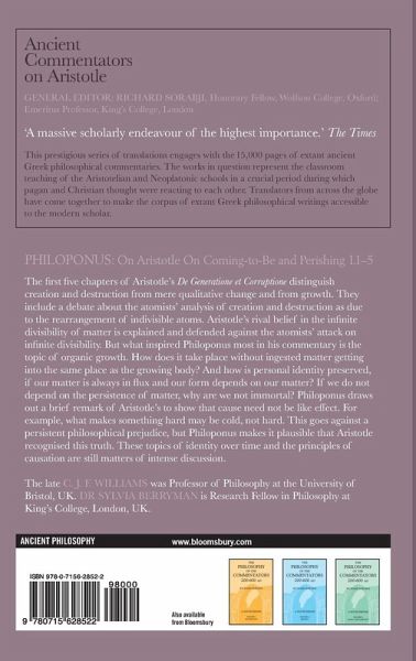 The first five chapters of Aristotle's De Generatione et Corruptione distinguish creation and destruction from mere qualitative change and from growth. They include a fascinating debate about the atomists' analysis of creation and destruction as due to the rearrangement of indivisible atoms. Aristotle's rival belief in the infinite divisibility of matter is explained and defended against the atomists' powerful attack on infinite divisibility. But what inspired Philoponus most in his commentary is the topic of organic growth. How does it take place without ingested matter getting into the same place as the growing body? And how is personal identity preserved, if our matter is always in flux, and our form depends on our matter? If we do not depend on the persistence of matter why are we not immortal? Analogous problems of identity arise also for inanimate beings. Philoponus draws out a brief remark of Aristotle's to show that cause need not be like effect. For example, what makes something hard may be cold, not hard. This goes against a persistent philosophical prejudice, but Philoponus makes it plausible that Aristotle recognized this truth. These topics of identity over time and the principles of causation are still matters of intense discussion.