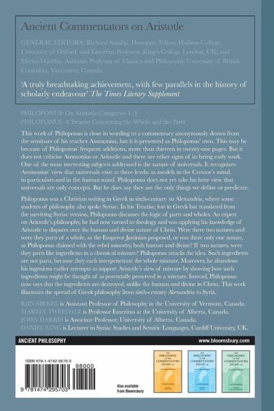 Philoponus' On Aristotle Categories 1-5 discusses the nature of universals, preserving the views of Philoponus' teacher Ammonius, as well as presenting a Neoplatonist interpretation of Aristotle's Categories. Philoponus treats universals as concepts in the human mind produced by abstracting a form or nature from the material individual in which it has its being. The work is important for its own philosophical discussion and for the insight it sheds on its sources. For considerable portions, On Aristotle Categories 1-5 resembles the wording of an earlier commentary which declares itself to be an anonymous record taken from the seminars of Ammonius. Unlike much of Philoponus' later writing, this commentary does not disagree with either Aristotle or Ammonius, and suggests the possibility that Philoponus either had access to this earlier record or wrote it himself. This edition explores these questions of provenance, alongside the context, meaning and implications of Philoponus' work. The English translation is accompanied by an introduction, comprehensive commentary notes, bibliography, glossary of translated terms and a subject index. The latest volume in the Ancient Commentators on Aristotle series, the edition makes this philosophical work accessible to a modern readership. Philoponus was a Christian writing in Greek in 6th century CE Alexandria, where some students of philosophy were bilingual in Syriac as well as Greek. In this Greek treatise translated from the surviving Syriac version, Philoponus discusses the logic of parts and wholes, and he illustrates the spread of the pagan and Christian philosophy of 6th century CE Greeks to other cultures, in this case to Syria. Philoponus, an expert on Aristotle's philosophy, had turned to theology and was applying his knowledge of Aristotle to disputes over the human and divine nature of Christ. Were there two natures and were they parts of a whole, as the Emperor Justinian proposed, or was there only one nature, as Philoponus claimed with the rebel minority, both human and divine? If there were two natures, were they parts like the ingredients in a chemical mixture? Philoponus attacks the idea. Such ingredients are not parts, because they each inter-penetrate the whole mixture. Moreover, he abandons his ingenious earlier attempts to support Aristotle's view of mixture by identifying ways in which such ingredients might be thought of as potentially preserved in a chemical mixture. Instead, Philoponus says that the ingredients are destroyed, unlike the human and divine in Christ. This English translation of Philoponus' treatise is the latest volume in the Ancient Commentators on Aristotle series and makes this philosophical work accessible to a modern readership. The translation in each volume is accompanied by an introduction, comprehensive commentary notes, bibliography, glossary of translated terms and a subject index.