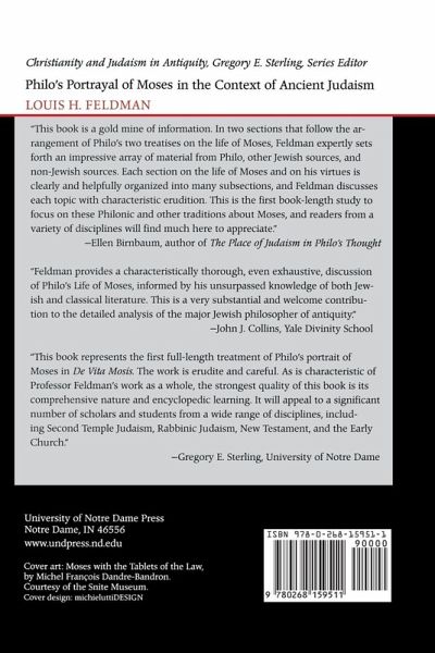 Philo's Portrayal of Moses in the Context of Ancient Judaism presents the most comprehensive study of Philo's De Vita Mosis that exists in any language. Feldman, well known for his work on Josephus and ancient Judaism, here paves new ground using rabbinic material with philological precision to illuminate important parallels and differences between Philo's writing on Moses and rabbinic literature. One way in which Hellenistic culture marginalized Judaism was by exposing the apparent defects in Moses' life and character. Philo's De Vita Mosis is a counterattack to these charges and is a vital piece of his attempt to reconcile Judaism and Hellenism. Feldman rigorously examines the text and shows how Philo presents a narrative of Moses's life similar to that of a mythical divine and heroic figure, glorifying his birth, education, and virtues. Feldman demonstrates that Philo is careful to explain in a scientific way those portions of the Bible, particularly miracles, that appear incredible to his skeptical Hellenistic readers. Through Feldman's careful analysis, Moses emerges as unique among ancient lawgivers. Philo's Portrayal of Moses in the Context of Ancient Judaism mirrors the organization of Philo's biography of Moses, which is in two books, the first, in the style of Plutarch, proceeding chronologically, and the second, in the style of Suetonius, arranged topically. Following an introductory chapter, Feldman's study discusses the life of Moses chronologically in the second chapter and examines his virtues topically in the third. Feldman compares the particular features of Philo's portrait of Moses with the way in which Moses is viewed both by Jewish sources in antiquity (including Pseudo-Philo; Josephus; Graeco-Jewish historians, poets, and philosophers; and in the Apocrypha, Pseudepigrapha, Samaritan tradition, Dead Sea Scrolls, and rabbinic tradition) and by non-Jewish sources, notably the Greek and Roman writers who mention him.