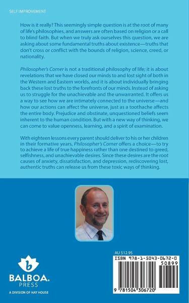 How is it really? This seemingly simple question is at the root of many of life's philosophies, and answers are often based on religion or a call to blind faith. But when we truly ask ourselves this question, we are asking about some fundamental truths about existence-truths that don't cross or conflict with the bounds of religion, science, creed, or nationality. Philosopher's Corner is not a traditional philosophy of life; it is about revelations that we have closed our minds to and lost sight of both in the Western and Eastern worlds, and it is about individually bringing back these lost truths to the forefronts of our minds. Instead of asking us to struggle for the unachievable and the unwarranted. It offers us a way to see how we are intimately connected to the universe-and how our actions can affect the universe, just as a toothache affects the entire body. Prejudice and obstinate, unquestioned beliefs seem inherent to the human condition. But with a new way of thinking, we can come to value openness, learning, and a spirit of examination. With eighteen lessons every parent should deliver to his or her children in their formative years, Philosopher's Corner offers a choice-to try to achieve a life of true happiness rather than one destined to greed, selfishness, and unachievable desires. Since these desires are the root causes of anxiety, dissatisfaction, and depression, rediscovering lost, authentic truths can release us from these toxic ways of thinking.