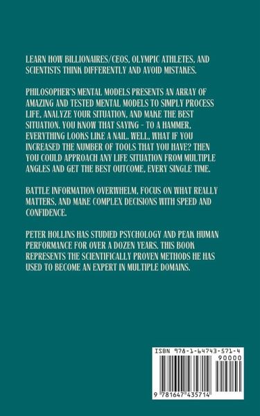 Learn directly from the world's greatest minds.... sort of. Some of these lessons have endured from hundreds of years. Others, for thousands. Come sample time-tested wisdom and how to implement it in your modern life. Learn how billionaires/CEOs, Olympic athletes, and scientists think differently and avoid mistakes. Philosopher's Mental Models presents an array of amazing and tested mental models to simply process life, analyze your situation, and make the best situation. You know that saying - to a hammer, everything looks like a nail. Well, what if you increased the number of tools that you have? Then you could approach any life situation from multiple angles and get the best outcome, every single time. Battle information overwhelm, focus on what really matters, and make complex decisions with speed and confidence. Peter Hollins has studied psychology and peak human performance for over a dozen years. This book represents the scientifically proven methods he has used to become an expert in multiple domains. Mental models for all walks of life: productivity, professional success, greater happiness, critical thinking, and decision-making. -Descartes' famous superpower of doubt and skepticism -How an "evil genius" will open your eyes to different possibilities and conclusions/ -Finding patterns in life and how they appear right in front of your nose (right now, even) -Acting without acting and the action of non-action. Huh? Yup. -"Eternal recurrence" and the consequences of your decisions. -Why you should do things "just in case" -Subtract and eliminate your way to the best decision possible -"The map is not the territory" -The true nature of regret and why you should embrace it