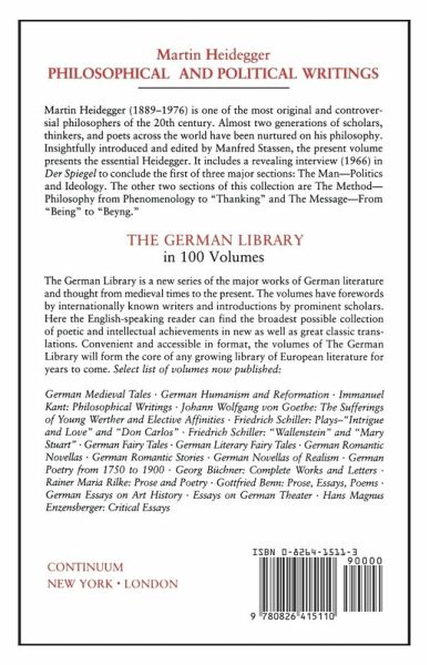Here is the essential Heidegger, a most controversial figure. Following a cogent introduction by Manfred Stassen, this collection is divided into three sections: The Man - Politics and Ideology; The Method - Philosophy from Phenomenology to "Thanking"; and The Message - From "Being" to "Beyng." All but one of the translations is a classic rendition. Among the content: "The Jewish Contamination of German Spiritual Life" (1929); "Follow the Fnhrer!" (1934); "The Thinker as Poet" (1947); "The Task of Destructuring of the History of Ontology (1927); "My Way to Phenomenology" (1963); "Being-in-the-World as Being-with and Being a Self: The 'They' (1927); "Care as the Being of Da-sein" (1927); "Poetically, Man Dwells" (1951); "The Question Concerning Technology" (1949); and much more.