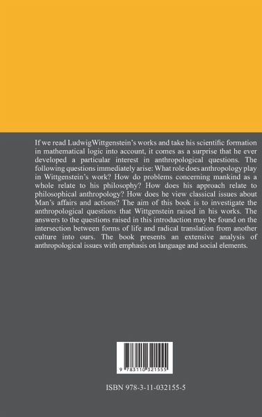 If we read Ludwig Wittgenstein's works and take his scientific formation in mathematical logic into account, it comes as a surprise that he ever developed a particular interest in anthropological questions. The following questions immediately arise: What role does anthropology play in Wittgenstein's work? How do problems concerning mankind as a whole relate to his philosophy? How does his approach relate to philosophical anthropology? How does he view classical issues about Man's affairs and actions? The aim of this book is to investigate the anthropological questions that Wittgenstein raised in his works. The answers to the questions raised in this introduction may be found on the intersection between forms of life and radical translation from another culture into ours. The book presents an extensive analysis of anthropological issues with emphasis on language and social elements.