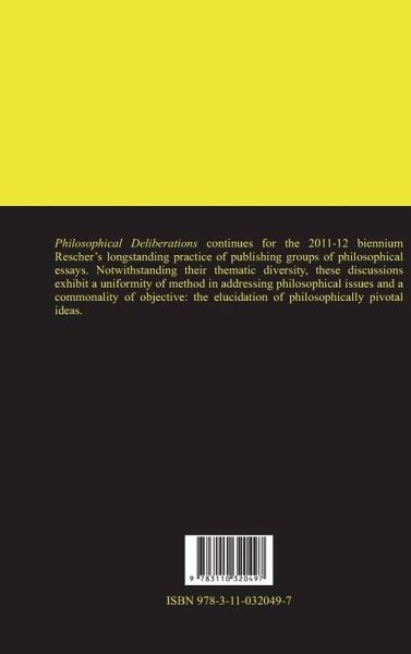Philosophical Deliberations continues for the 2011/12 biennium Rescher longstanding practice of publishing groups of philosophical essays. Notwithstanding their thematic diversity, these discussions exhibit a uniformity of method in addressing philosophical issues and a commonality of objective: the elucidation of philosophically pivotal ideas.