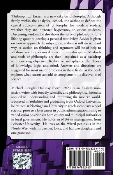 'Philosophical Essays' is a new take on philosophy. Although firmly within the analytical school, the author re-defines the central subject-matter of philosophy for modern readers, whether they are interested laypersons, or serious students. Discussing wisdom, he also shows the value of philosophy for a lifelong quest to develop a personal worldview. Advice is given on how to approach the subject, too, as there is still no standard way. A section on thinking and argument will be of help to all those needing a critical stance in any discipline. Methods and tools of philosophy are then explained as a backdrop to discovering objective Reality via metaphysics, the theory of knowledge, logic, and mind. Answers and directions are suggested for most major problems in these fields, as the book explores what reason can add to complement the discoveries of science. Michael Douglas Halliday (born 1945) is an English non-fiction writer with broadly scientific and philosophical interests applied to understanding and improving the modern world. Educated in Yorkshire and graduating from Oxford University, he trained at Nottingham University to teach secondary school science, prior to a later career in public administration, rising to varied senior positions in both county and municipal authorities in local government. He holds an MBA in management from Leicester University. He lives on the Wirral peninsula in the North-West with his partner, Joyce, and has two daughters and one grandson.