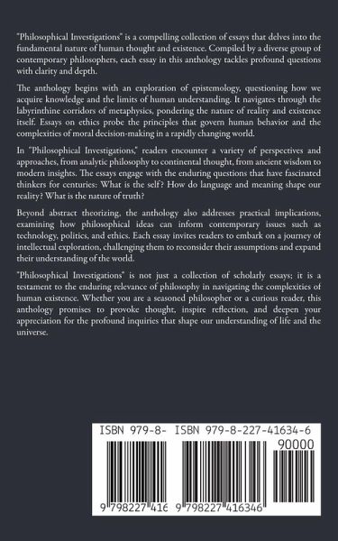 "Philosophical Investigations" is a compelling collection of essays that delves into the fundamental nature of human thought and existence. Compiled by a diverse group of contemporary philosophers, each essay in this anthology tackles profound questions with clarity and depth. The anthology begins with an exploration of epistemology, questioning how we acquire knowledge and the limits of human understanding. It navigates through the labyrinthine corridors of metaphysics, pondering the nature of reality and existence itself. Essays on ethics probe the principles that govern human behavior and the complexities of moral decision-making in a rapidly changing world. In "Philosophical Investigations," readers encounter a variety of perspectives and approaches, from analytic philosophy to continental thought, from ancient wisdom to modern insights. The essays engage with the enduring questions that have fascinated thinkers for centuries: What is the self? How do language and meaning shape our reality? What is the nature of truth? Beyond abstract theorizing, the anthology also addresses practical implications, examining how philosophical ideas can inform contemporary issues such as technology, politics, and ethics. Each essay invites readers to embark on a journey of intellectual exploration, challenging them to reconsider their assumptions and expand their understanding of the world. "Philosophical Investigations" is not just a collection of scholarly essays; it is a testament to the enduring relevance of philosophy in navigating the complexities of human existence. Whether you are a seasoned philosopher or a curious reader, this anthology promises to provoke thought, inspire reflection, and deepen your appreciation for the profound inquiries that shape our understanding of life and the universe.