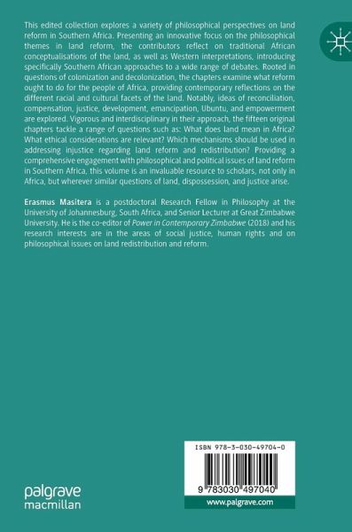 Chapter 1. Thinking about land reform in Southern Africa: The Introduction. Erasmus Masitera.- Part I: History and Logic on Land.- Chapter 2. Exploring foundational principles for land redistribution and management in Africa. Aderonke Adegbite.- Chapter 3. Political economy and the socio-cultural history of land dispossession, proselytization, and proletarianization of African people in South Africa: 1488 - 1770 (Part 1). Mbhekeni Sabelo Nkosi.- Chapter 4. Political economy and the socio-cultural history of land dispossession, proselytization, and proletarianization of African people in South Africa: 1795 - 1854 (Part 2). Mbhekeni Sabelo Nkosi.- Chapter 5. Ivhu kuvanhu/umhlaba ebantwini: The violent Ubuntu in the Fast Track Land Reform Programme in Zimbabwe. Joseph P. Hungwe.- Chapter 6. A Logical Evaluation of the Fast Track Land Reform Economic Argument in Zimbabwe. Ephraim T. Gwaravanda.- Part II:Restitution, Compensation, and Development.- Chapter 7. 'We acknowledge that we reside on...': Canadian Land Acknowledgments and South African Land Reform. Yolandi Coetser.- Chapter 8. Must Land Reform Benefit the Victims of Colonialism?. Thaddeus Metz.- Chapter 9. Reconciling 'Title to land and Productivity' in land debates in Africa. Dennis Masaka.- Chapter 10. Is land reform the last step towards Africans' total emancipation and true empowerment?. Bernard Matolino.- Part III: Land Jurisprudence (and Justice issues).- Chapter 11. Integrating African Social Tenure with Rights Recognition in Land Reform. Christopher Allsobrook.- Chapter 12. Land reform and Redistribution as Environmental Justice Framework for Postcolonial Africa. Munamato Chemhuru.- Chapter 13. Individual Justice in Land Redistribution: Appropriating some Ideas from the Capability Approach. Erasmus Masitera.- Part IV: African Ethics and/on Land Reform and Redistribution.- Chapter 14. Towards a Critical Ethic of Land in Southern African Context. Mark Rathbone and Anne. H Verhoef.- Chapter 1. What Can Ubuntu Do? A Reflection on African Moral Theory in Light of Post-Colonial Challenges. Motsamai Molefe & Nolubabalo Magam.- Chapter 16. Understanding Unhu/Ubuntu as a Moral Thought on Land Redistribution in Zimbabwe: Ethical Lessons for Future land Reform in Sub-Saharan Africa. Rodwell K. Wuta.