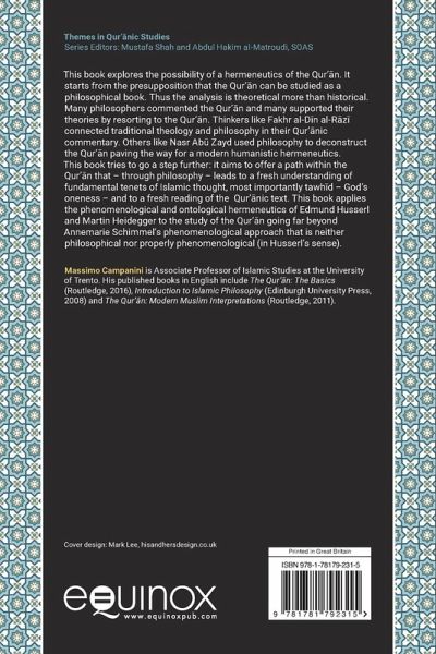 This book explores the possibility of a hermeneutics of the Qur'an. It starts from the presupposition that the Qur'an can be studied as a philosophical book. Thus the analysis is theoretical more than historical. Many philosophers commented the Qur'an and many supported their theories by resorting to the Qur'an. Thinkers like Fakhr al-Din al-Razi connected traditional theology and philosophy in their Qur'anic commentary. Others like Nasr Abu Zayd used philosophy to deconstruct the Qur'an paving the way for a modern humanistic hermeneutics. This book tries to go a step further: it aims to offer a path within the Qur'an that - through philosophy - leads to a fresh understanding of fundamental tenets of Islamic thought, most importantly tawhid - God's oneness - and to a fresh reading of the Qur'anic text. This book applies the phenomenological and ontological hermeneutics of Edmund Husserl and Martin Heidegger to the study of the Qur'an going far beyond Annemarie Schimmel's phenomenological approach that is neither philosophical nor properly phenomenological (in Husserl's sense).
