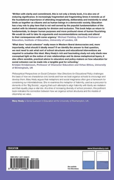 What would the civic relationship between citizens in a socially cohesive society look like? What models might we use to educate young people to support developing these bonds? Do these different models have different implications for how we structure the bonds that support a civic relationship? Philosophical Perspectives on Social Cohesion challenges the basis of how we characterize civic bonds and how we best organize schools to encourage and develop them. Mary Healy argues that metaphors and social imaginaries often give a framework for considering our interrelatedness. She re-examines the metaphor of fraternity, used as a precursor to elements of the 'Big Society', arguing that such attempts to align fraternity with liberty are mistaken and that equality plays a vital role. At a time of increasing diversity of school provision, this pertinent book indicates the connection between how we organize school structures and the models of citizenship we value.