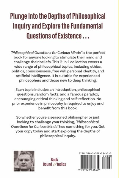 Dive into the Deepest Philosophical Questions with "Philosophical Questions for Curious Minds" Are you ready to stimulate your mind and challenge your beliefs? Look no further than "Philosophical Questions for Curious Minds," the third and final book in the "Philosophy for the Curious" series. This book is a collection of the first and second books in its series. This book covers a wide range of philosophical topics, including ethics, politics, consciousness, free will, personal identity, and artificial intelligence. What makes this book special?Get twice the philosophical bang for your buck with this 2-in-1 collection of the first and second books in its series! Enjoy the additional bonus chapter-because two books of philosophical questions just weren't enough. Each topic includes an introduction, philosophical questions, random facts, and a famous paradox. Suitable for both experienced philosophers and those new to deep thinking. It encourages critical thinking and self-reflection. It's the perfect gift for that one person in your life who always has a deep, philosophical comment about everything (you know who they are.) But I don't have any experience in philosophy-No prior experience in philosophy is required to enjoy and benefit from this book. Each topic starts you off with three answered philosophical questions from differing perspectives. I don't have time to read a book on philosophical topics-The questions in this book are designed to be thought-provoking and stimulating, making it a quick and engaging read. Whether you're a seasoned philosopher or just looking to challenge your thinking, "Philosophical Questions for Curious Minds" has something for you. Get your copy today and start exploring the depths of philosophical inquiry.