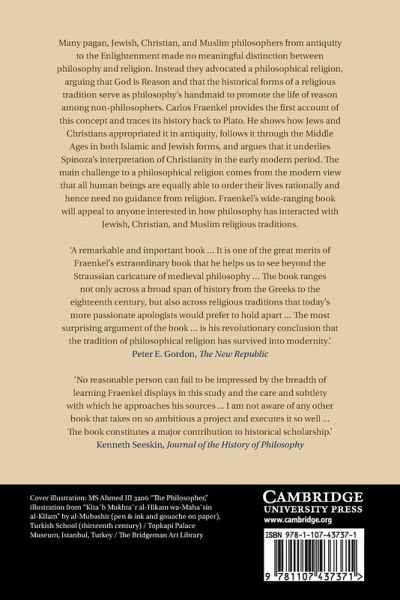 Many pagan, Jewish, Christian and Muslim philosophers from Antiquity to the Enlightenment made no meaningful distinction between philosophy and religion. Instead they advocated a philosophical religion, arguing that God is Reason and that the historical forms of a religious tradition serve as philosophy's handmaid to promote the life of reason among non-philosophers. Carlos Fraenkel provides the first account of this concept and traces its history back to Plato. He shows how Jews and Christians appropriated it in Antiquity, follows it through the Middle Ages in both Islamic and Jewish forms and argues that it underlies Spinoza's interpretation of Christianity. The main challenge to a philosophical religion comes from the modern view that all human beings are equally able to order their lives rationally and hence need no guidance from religion. Fraenkel's wide-ranging book will appeal to anyone interested in how philosophy has interacted with Jewish, Christian, and Muslim religious traditions.