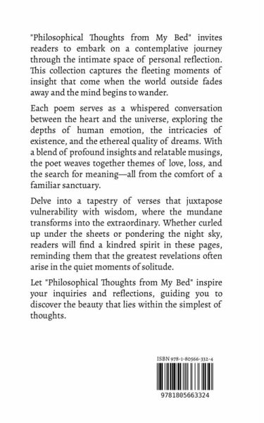 "Philosophical Thoughts from My Bed" invites readers to embark on a contemplative journey through the intimate space of personal reflection. This collection captures the fleeting moments of insight that come when the world outside fades away and the mind begins to wander. Each poem serves as a whispered conversation between the heart and the universe, exploring the depths of human emotion, the intricacies of existence, and the ethereal quality of dreams. With a blend of profound insights and relatable musings, the poet weaves together themes of love, loss, and the search for meaning-all from the comfort of a familiar sanctuary. Delve into a tapestry of verses that juxtapose vulnerability with wisdom, where the mundane transforms into the extraordinary. Whether curled up under the sheets or pondering the night sky, readers will find a kindred spirit in these pages, reminding them that the greatest revelations often arise in the quiet moments of solitude. Let "Philosophical Thoughts from My Bed" inspire your inquiries and reflections, guiding you to discover the beauty that lies within the simplest of thoughts.