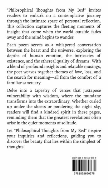 "Philosophical Thoughts from My Bed" invites readers to embark on a contemplative journey through the intimate space of personal reflection. This collection captures the fleeting moments of insight that come when the world outside fades away and the mind begins to wander. Each poem serves as a whispered conversation between the heart and the universe, exploring the depths of human emotion, the intricacies of existence, and the ethereal quality of dreams. With a blend of profound insights and relatable musings, the poet weaves together themes of love, loss, and the search for meaning-all from the comfort of a familiar sanctuary. Delve into a tapestry of verses that juxtapose vulnerability with wisdom, where the mundane transforms into the extraordinary. Whether curled up under the sheets or pondering the night sky, readers will find a kindred spirit in these pages, reminding them that the greatest revelations often arise in the quiet moments of solitude. Let "Philosophical Thoughts from My Bed" inspire your inquiries and reflections, guiding you to discover the beauty that lies within the simplest of thoughts.