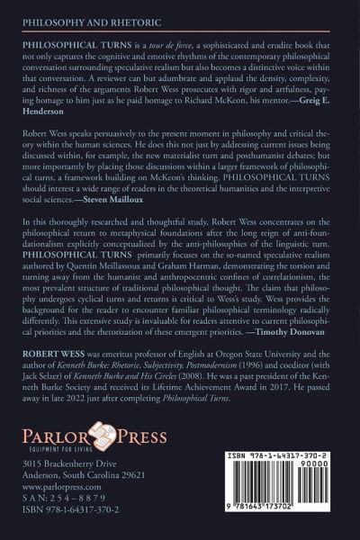 Philosophical Turns is a tour de force, a sophisticated and erudite book that not only captures the cognitive and emotive rhythms of the contemporary philosophical conversation surrounding speculative realism but also becomes a distinctive voice within that conversation. A reviewer can but adumbrate and applaud the density, complexity, and richness of the arguments Robert Wess prosecutes with rigor and artfulness, paying homage to him just as he paid homage to Richard McKeon, his mentor.-Greig E. Henderson Robert Wess speaks persuasively to the present moment in philosophy and critical theory within the human sciences. He does this not just by addressing current issues being discussed within, for example, the new materialist turn and posthumanist debates; but more importantly by placing those discussions within a larger framework of philosophical turns, a framework building on McKeon's thinking. Philosophical Turns should interest a wide range of readers in the theoretical humanities and the interpretive social sciences.-Steven Mailloux In this thoroughly researched and thoughtful study, Robert Wess concentrates on the philosophical return to metaphysical foundations after the long reign of anti-foundationalism explicitly conceptualized by the anti-philosophies of the linguistic turn. Philosophical Turns primarily focuses on the so-named speculative realism authored by Quentin Meillassoux and Graham Harman, demonstrating the torsion and turning away from the humanist and anthropocentric confines of correlationism, the most prevalent structure of traditional philosophical thought. The claim that philosophy undergoes cyclical turns and returns is critical to Wess's study. Wess provides the background for the reader to encounter familiar philosophical terminology radically differently. This extensive study is invaluable for readers attentive to current philosophical priorities and the rhetorization of these emergent priorities. -Timothy Donovan Robert Wess was emeritus professor of English at Oregon State University. He received a BA, MA, and PhD at the University of Chicago. While at Chicago, time in Richard McKeon's classroom inspired Wess to become a lifelong student of McKeon's work, publishing a few articles on him and Kenneth Burke along the way and now publishing this book that is the product of years of work. Wess attended the 1984 conference at which the Kenneth Burke Society was formed and later received the Society's Distinguished Service Award (1999) and Lifetime Achievement Award (2017). He served as the Society's president from 2005 to 2008. He passed away in late 2022 just after completing Philosophical Turns. Wess was the author of Kenneth Burke: Rhetoric, Subjectivity, Postmodernism (1996) and coeditor (with Jack Selzer) of Kenneth Burke and His Circles (2008). His articles were published in such journals as KB: The Journal of the Kenneth Burke Society, Modern Philology, Pre/Text, The Minnesota Review, ISLE: Interdisciplinary Studies in Literature and Environment, and Restoration.