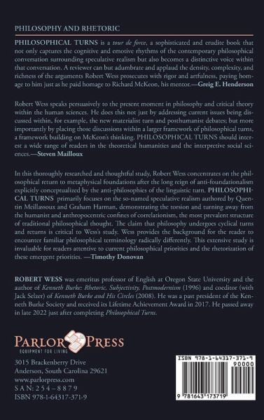 Philosophical Turns is a tour de force, a sophisticated and erudite book that not only captures the cognitive and emotive rhythms of the contemporary philosophical conversation surrounding speculative realism but also becomes a distinctive voice within that conversation. A reviewer can but adumbrate and applaud the density, complexity, and richness of the arguments Robert Wess prosecutes with rigor and artfulness, paying homage to him just as he paid homage to Richard McKeon, his mentor.-Greig E. Henderson Robert Wess speaks persuasively to the present moment in philosophy and critical theory within the human sciences. He does this not just by addressing current issues being discussed within, for example, the new materialist turn and posthumanist debates; but more importantly by placing those discussions within a larger framework of philosophical turns, a framework building on McKeon's thinking. Philosophical Turns should interest a wide range of readers in the theoretical humanities and the interpretive social sciences.-Steven Mailloux In this thoroughly researched and thoughtful study, Robert Wess concentrates on the philosophical return to metaphysical foundations after the long reign of anti-foundationalism explicitly conceptualized by the anti-philosophies of the linguistic turn. Philosophical Turns primarily focuses on the so-named speculative realism authored by Quentin Meillassoux and Graham Harman, demonstrating the torsion and turning away from the humanist and anthropocentric confines of correlationism, the most prevalent structure of traditional philosophical thought. The claim that philosophy undergoes cyclical turns and returns is critical to Wess's study. Wess provides the background for the reader to encounter familiar philosophical terminology radically differently. This extensive study is invaluable for readers attentive to current philosophical priorities and the rhetorization of these emergent priorities. -Timothy Donovan Robert Wess was emeritus professor of English at Oregon State University. He received a BA, MA, and PhD at the University of Chicago. While at Chicago, time in Richard McKeon's classroom inspired Wess to become a lifelong student of McKeon's work, publishing a few articles on him and Kenneth Burke along the way and now publishing this book that is the product of years of work. Wess attended the 1984 conference at which the Kenneth Burke Society was formed and later received the Society's Distinguished Service Award (1999) and Lifetime Achievement Award (2017). He served as the Society's president from 2005 to 2008. He passed away in late 2022 just after completing Philosophical Turns. Wess was the author of Kenneth Burke: Rhetoric, Subjectivity, Postmodernism (1996) and coeditor (with Jack Selzer) of Kenneth Burke and His Circles (2008). His articles were published in such journals as KB: The Journal of the Kenneth Burke Society, Modern Philology, Pre/Text, The Minnesota Review, ISLE: Interdisciplinary Studies in Literature and Environment, and Restoration.