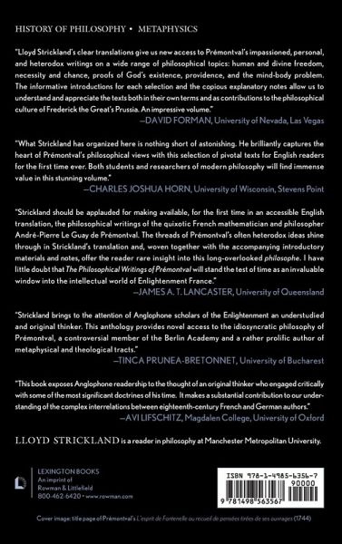 In this volume, Lloyd Strickland makes the key philosophical writings of maverick Enlightenment philosopher André-Pierre Le Guay de Prémontval (1716-1764) available in English for the first time. His writings contain many provocative ideas and arguments, and anticipate modern developments such as open theism, process theology, and animal theodicy.