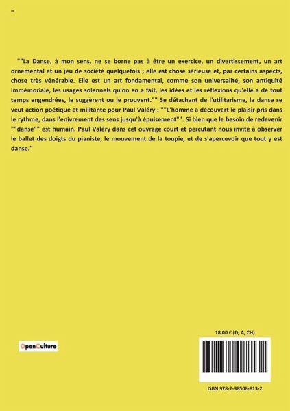 " ""La Danse, à mon sens, ne se borne pas à être un exercice, un divertissement, un art ornemental et un jeu de société quelquefois ; elle est chose sérieuse et, par certains aspects, chose très vénérable. Elle est un art fondamental, comme son universalité, son antiquité immémoriale, les usages solennels qu'on en a fait, les idées et les réflexions qu'elle a de tout temps engendrées, le suggèrent ou le prouvent."" Se détachant de l'utilitarisme, la danse se veut action poétique et militante pour Paul Valéry : ""L'homme a découvert le plaisir pris dans le rythme, dans l'enivrement des sens jusqu'à épuisement"". Si bien que le besoin de redevenir ""danse"" est humain. Paul Valéry dans cet ouvrage court et percutant nous invite à observer le ballet des doigts du pianiste, le mouvement de la toupie, et de s'apercevoir que tout y est danse."