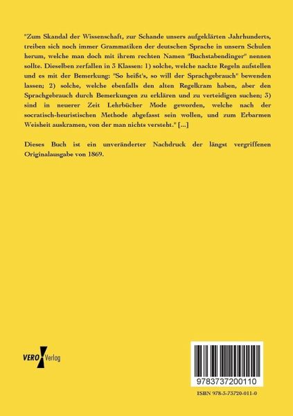 "Zum Skandal der Wissenschaft, zur Schande unsers aufgeklärten Jahrhunderts, treiben sich noch immer Grammatiken der deutschen Sprache in unsern Schulen herum, welche man doch mit ihrem rechten Namen "Buchstabendinger" nennen sollte. Dieselben zerfallen in 3 Klassen: 1) solche, welche nackte Regeln aufstellen und es mit der Bemerkung: "So heißt's, so will der Sprachgebrauch" bewenden lassen; 2) solche, welche ebenfalls den alten Regelkram haben, aber den Sprachgebrauch durch Bemerkungen zu erklären und zu verteidigen suchen; 3) sind in neuerer Zeit Lehrbücher Mode geworden, welche nach der socratisch-heuristischen Methode abgefasst sein wollen, und zum Erbarmen Weisheit auskramen, von der man nichts versteht." [...]