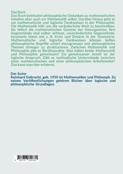 Philosophie der Mathematik und mathematische Philosophie sind Gegenstand des Buches. Das Buch beinhaltet philosophische Gedanken zu mathematischen Inhalten aber auch zur Mathematik selbst. Darüber hinaus geht es um mathematische und logische Denkweisen in der Philosophie. Die Mathematik hilft uns, die veränderliche Welt zu beschreiben. Sie liefert die mathematischen Gesetze der Naturgesetze; ihre Gegenstände sind selber zeitlose, unveränderliche Gegenstände, konstante Ideen, wie z. B. Kreis und Dreieck in der Geometrie. Mathematische und logische Denkweisen können helfen, philosophische Begriffe scharf einzugrenzen und philosophische Themen strenger zu strukturieren. Zwischen Mathematik und Philosophie gibt es Berührpunkte. Was haben beide, Mathematik und Philosophie, gemeinsam? Ein gemeinsamer Anteil ist der logische Anspruch. Wo befinden sich die Unterschiede? Gibt es methodische Unterschiede zwischen einer mathematischen und einer philosophischen Arbeitsweise? Das kann man hier erfahren.Das vorliegende Buch soll mathematisch Interessierte und philosophisch Interessierte anregen. Es ist einerseits ein Versuch einer Philosophie der Mathematik, die dem Mathematiker Anregung geben soll für philosophische Gedankengänge, andererseits soll das Buch aber auch den Philosophen anregen, die mathematischen Methoden und Schönheiten der Mathematik näher kennen zu lernen und schätzen zu lernen. Damit soll insgesamt auch auf eine Schnittstelle und Schnittmenge zwischen Mathematik und Philosophie aufmerksam gemacht werden.Buchbesprechung von: www.literaturmarkt.infoPhilosophie der Mathematik und Logik: Sachliteratur mit großem Wissensmehrwert [...] Endlich wagt es jemand, (wissenschaftliche) Grenzen zu überschreiten. Man wirft einen Blick weit über den bekannten Tellerrand hinaus. [...] Schade, dass dieses Werk noch nicht Standard an Deutschlands Schulen ist. Es könnte nämlich den Matheunterricht um einiges aufregender machen. Gobrecht eröffnet eine neue Möglichkeit von einer "Philosophie der Mathematik". Hut ab für diese Glanzleistung!Mai 2018
