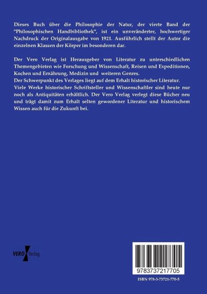 Dieses Buch über die Philosophie der Natur, der vierte Band der "Philosophischen Handbibliothek", ist ein unveränderter, hochwertiger Nachdruck der Originalausgabe von 1921. Ausführlich stellt der Autor die einzelnen Klassen der Körper im besonderen dar.