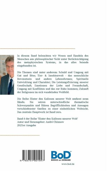 In diesem Band beleuchten wir Wesen und Handeln des Menschen aus philosophischer Sicht unter Berücksichtigung des metaphysischen Systems, in das alles Seiende eingebunden ist.Die Themen sind unter anderem: Schuld und Umgang mit Gut und Böse; Tier- & Insektenwelt - das menschliche Bewusstsein und andere Lebensformen; Spirituelle Entwicklung und Charakter; Die Leistungsfixierung unserer Gesellschaft; Emotionen der Liebe und Freundschaft, Umgang mit Konflikten und das zur Ruhe kommen; Zukunft der Religionen im sich wandelnden Weltbild.Die Reihe 'Hinter den Kulissen unserer Welt' umfasst neun Bände. Sie setzen unterschiedliche thematische Schwerpunkte und führen Begrifflichkeiten und Aussagen verschiedenster Quellen zu einer einheitlichen Weltsicht. Das zentrale Hauptwerk ist Band zero. Eine Übersicht finden Sie unter andre.chinnow.net