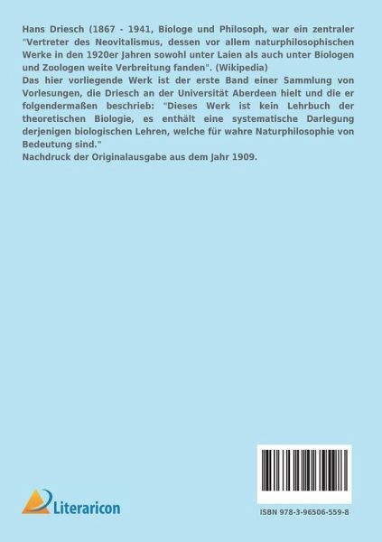 Hans Driesch (1867 - 1941, Biologe und Philosoph, war ein zentraler "Vertreter des Neovitalismus, dessen vor allem naturphilosophischen Werke in den 1920er Jahren sowohl unter Laien als auch unter Biologen und Zoologen weite Verbreitung fanden". (Wikipedia) Das hier vorliegende Werk ist der erste Band einer Sammlung von Vorlesungen, die Driesch an der Universität Aberdeen hielt und die er folgendermaßen beschrieb: "Dieses Werk ist kein Lehrbuch der theoretischen Biologie, es enthält eine systematische Darlegung derjenigen biologischen Lehren, welche für wahre Naturphilosophie von Bedeutung sind." Nachdruck der Originalausgabe aus dem Jahr 1909.