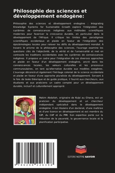Philosophie des sciences et développement endogène : Integrating Knowledge Systems for Sustainable Growth explore l'intégration des systèmes de connaissances indigènes aux méthodes scientifiques modernes pour favoriser la croissance durable, en particulier dans le développement de l'Afrique. Il critique les limites des paradigmes scientifiques occidentaux et plaide en faveur de l'intégration des épistémologies locales pour relever les défis du développement mondial. À travers le prisme de la philosophie des sciences, l'ouvrage examine les questions clés de l'objectivité, de la vérité et de l'universalité et met en contraste les traditions occidentales avec les systèmes de connaissances indigènes. Il propose un cadre pour l'intégration de ces diverses approches et plaide en faveur d'un développement endogène, ancré dans les connaissances locales, les valeurs culturelles et les processus communautaires, en tant qu'alternative durable aux modèles exogènes. L'ouvrage déconstruit également l'héritage colonial de la science occidentale et plaide en faveur d'une approche pluraliste du développement. Servant à la fois de texte théorique et de guide pratique, il fournit aux chercheurs, aux étudiants et aux praticiens un cadre complet pour un développement durable, inclusif et culturellement approprié.