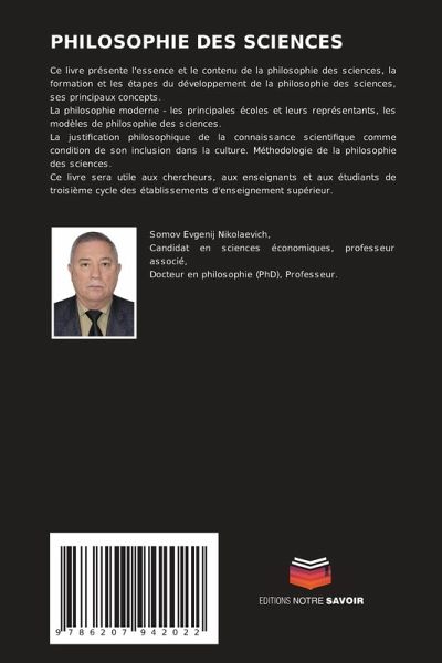 Ce livre présente l'essence et le contenu de la philosophie des sciences, la formation et les étapes du développement de la philosophie des sciences, ses principaux concepts.La philosophie moderne - les principales écoles et leurs représentants, les modèles de philosophie des sciences.La justification philosophique de la connaissance scientifique comme condition de son inclusion dans la culture. Méthodologie de la philosophie des sciences.Ce livre sera utile aux chercheurs, aux enseignants et aux étudiants de troisième cycle des établissements d'enseignement supérieur.