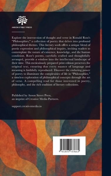 Explore the intersection of thought and verse in Ronald Ross's "Philosophies," a collection of poetry that delves into profound philosophical themes. This literary work offers a unique blend of poetic expression and philosophical inquiry, inviting readers to contemplate the nature of existence, knowledge, and the human condition. Ross's poems, carefully crafted and thoughtfully arranged, provide a window into the intellectual landscape of their time. This meticulously prepared print edition preserves the original text, ensuring that every nuance of language and meaning is faithfully reproduced. Discover the enduring power of poetry to illuminate the complexities of life in "Philosophies," a timeless exploration of philosophical concepts through the art of verse. A compelling read for those interested in poetry, philosophy, and the rich tradition of literary collections. This work has been selected by scholars as being culturally important, and is part of the knowledge base of civilization as we know it. This work is in the public domain in the United States of America, and possibly other nations. Within the United States, you may freely copy and distribute this work, as no entity (individual or corporate) has a copyright on the body of the work. Scholars believe, and we concur, that this work is important enough to be preserved, reproduced, and made generally available to the public. We appreciate your support of the preservation process, and thank you for being an important part of keeping this knowledge alive and relevant.